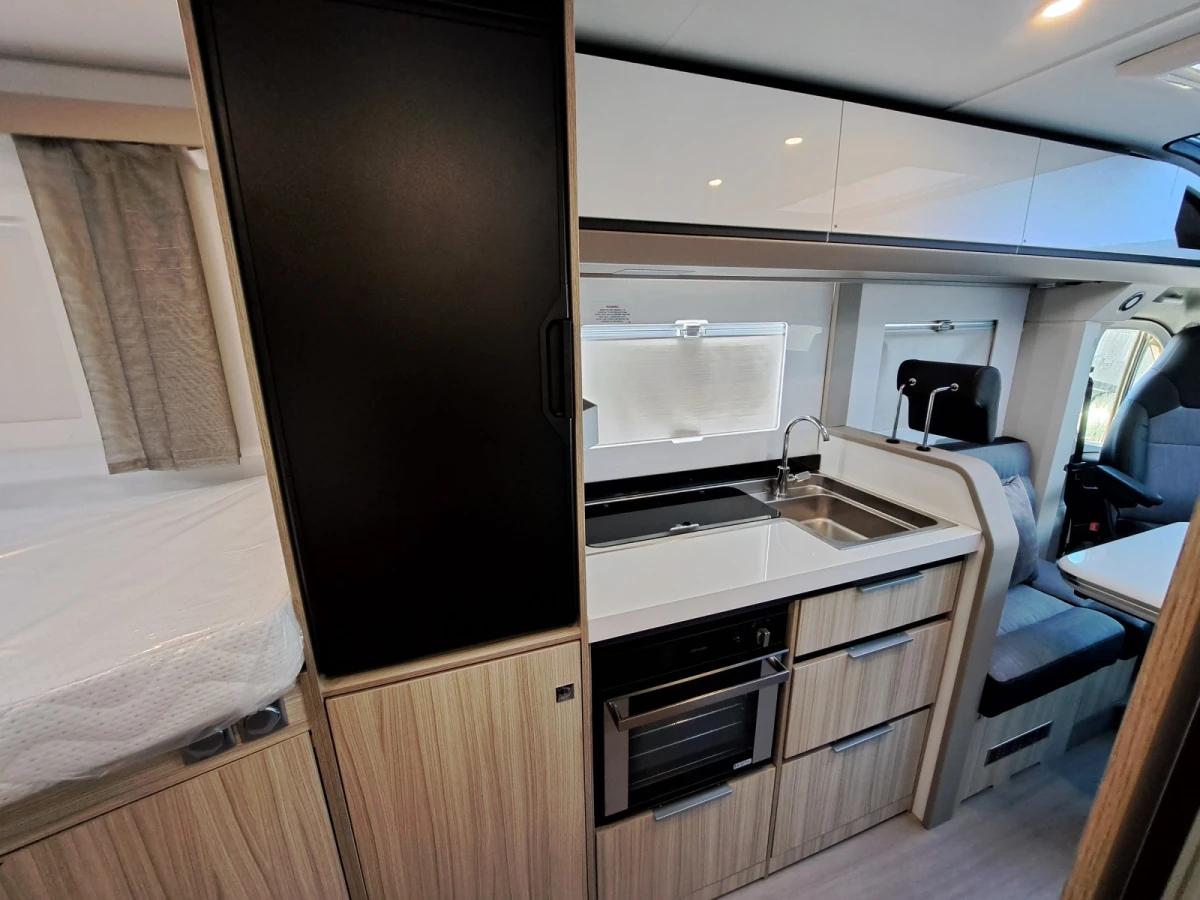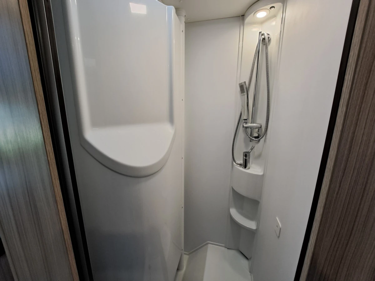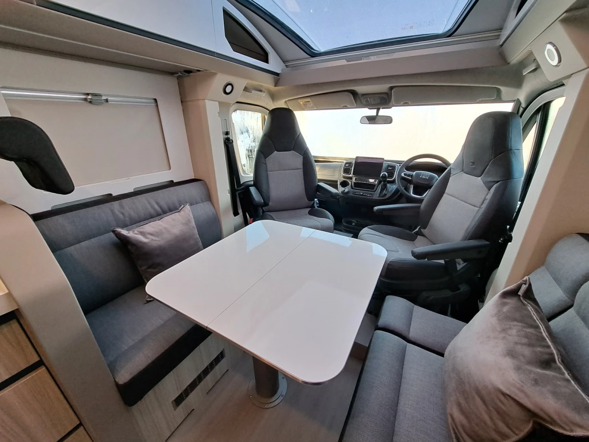 Choose between fixed twin single beds or a large rear double. The bright lounge area benefits from Adria’s panoramic sunroof, while the fully equipped kitchen includes a 3-burner hob, combi oven, and fridge-freezer. The smart bathroom layout offers shower, toilet, and storage all in a compact space.