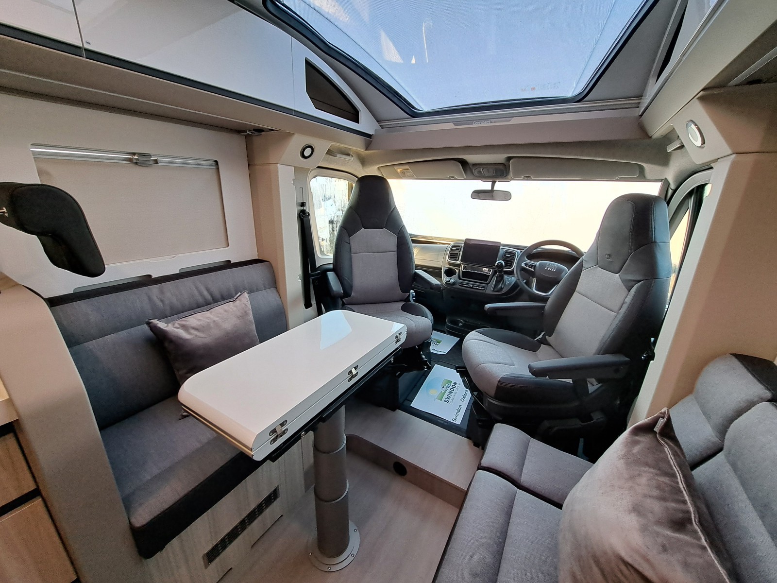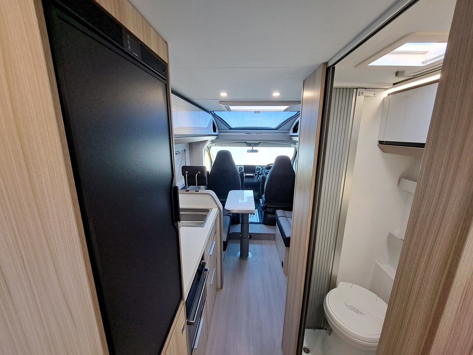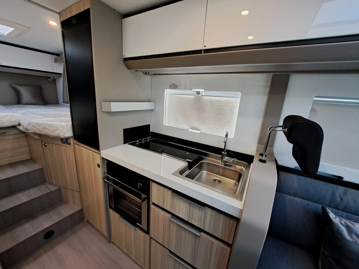 Choose between fixed twin single beds or a large rear double. The bright lounge area benefits from Adria’s panoramic sunroof, while the fully equipped kitchen includes a 3-burner hob, combi oven, and fridge-freezer. The smart bathroom layout offers shower, toilet, and storage all in a compact space.