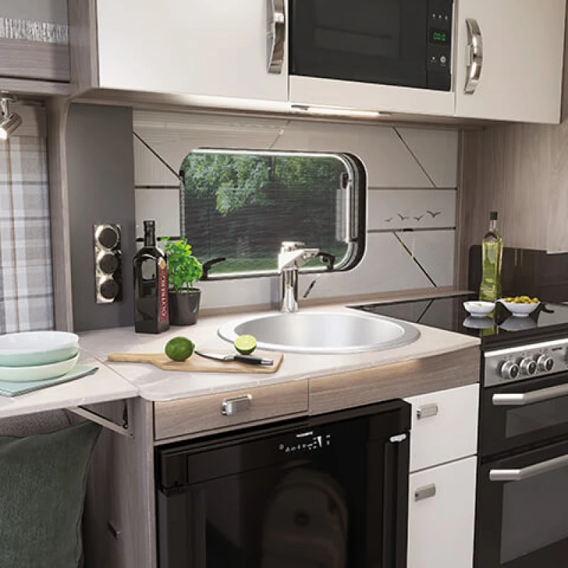 The range now comes with the new Galloway soft furnishing scheme, a grade 5 fabric that exceeds domestic standards. Alde dual fuel central heating comes as standard as well as external BBQ and mains points. Low energy LED lighting and a wide choice of seating layouts help to set the mood alongside the new Sangallo Elm woodgrain furniture.