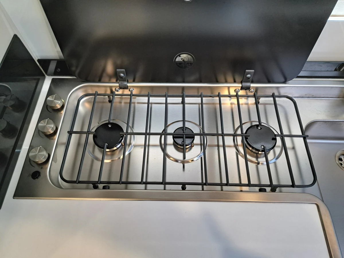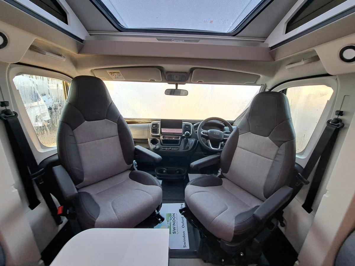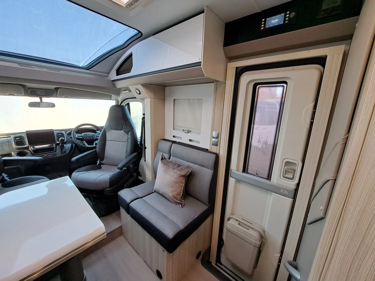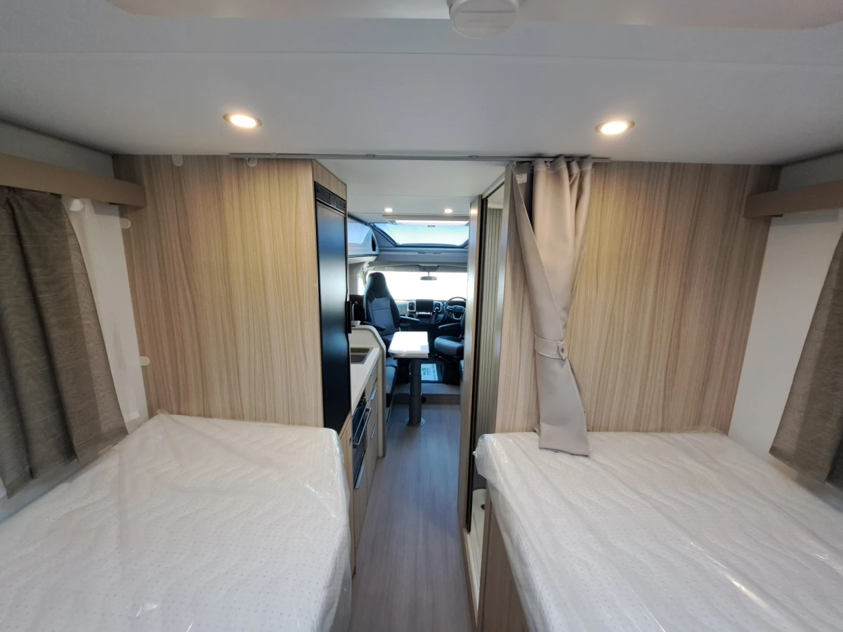 Choose between fixed twin single beds or a large rear double. The bright lounge area benefits from Adria’s panoramic sunroof, while the fully equipped kitchen includes a 3-burner hob, combi oven, and fridge-freezer. The smart bathroom layout offers shower, toilet, and storage all in a compact space.
