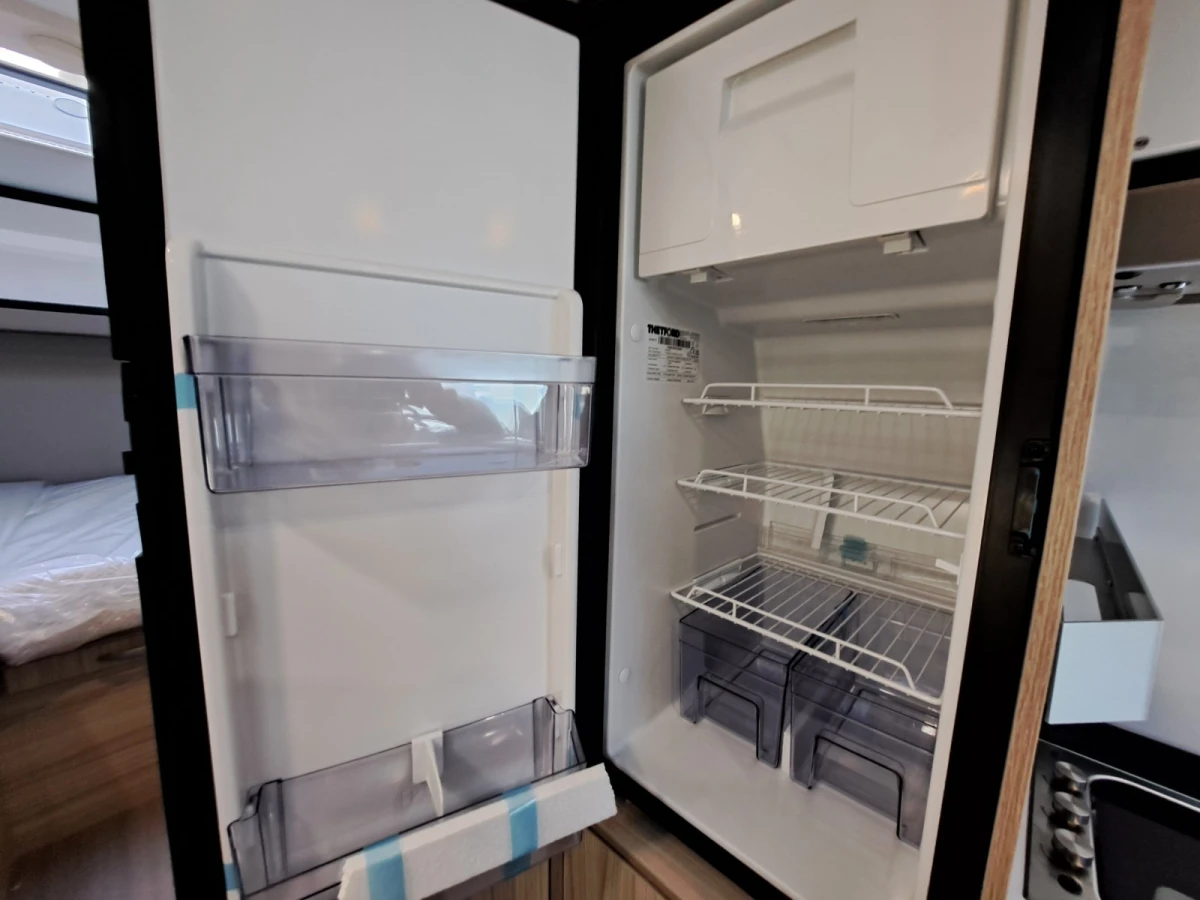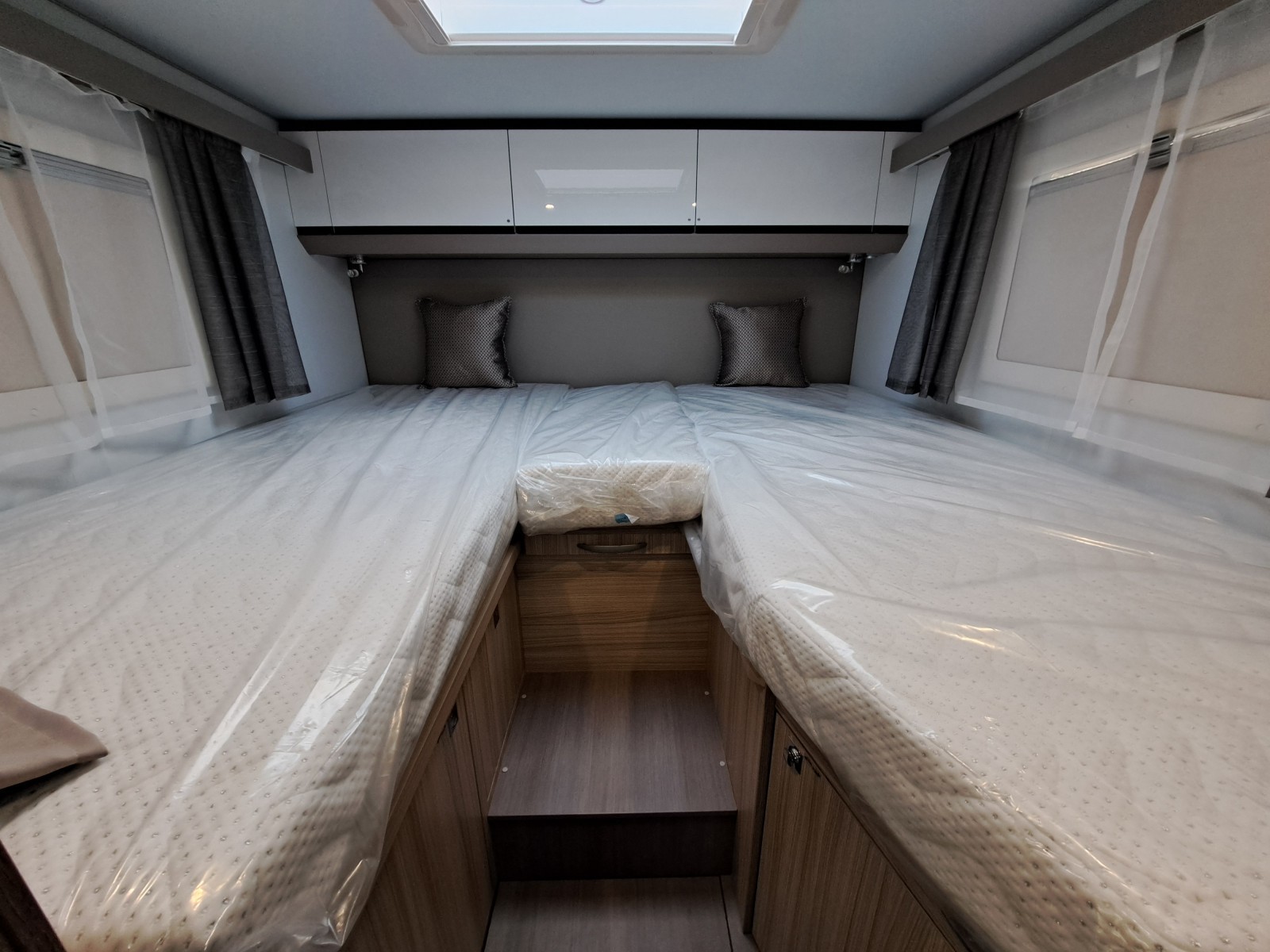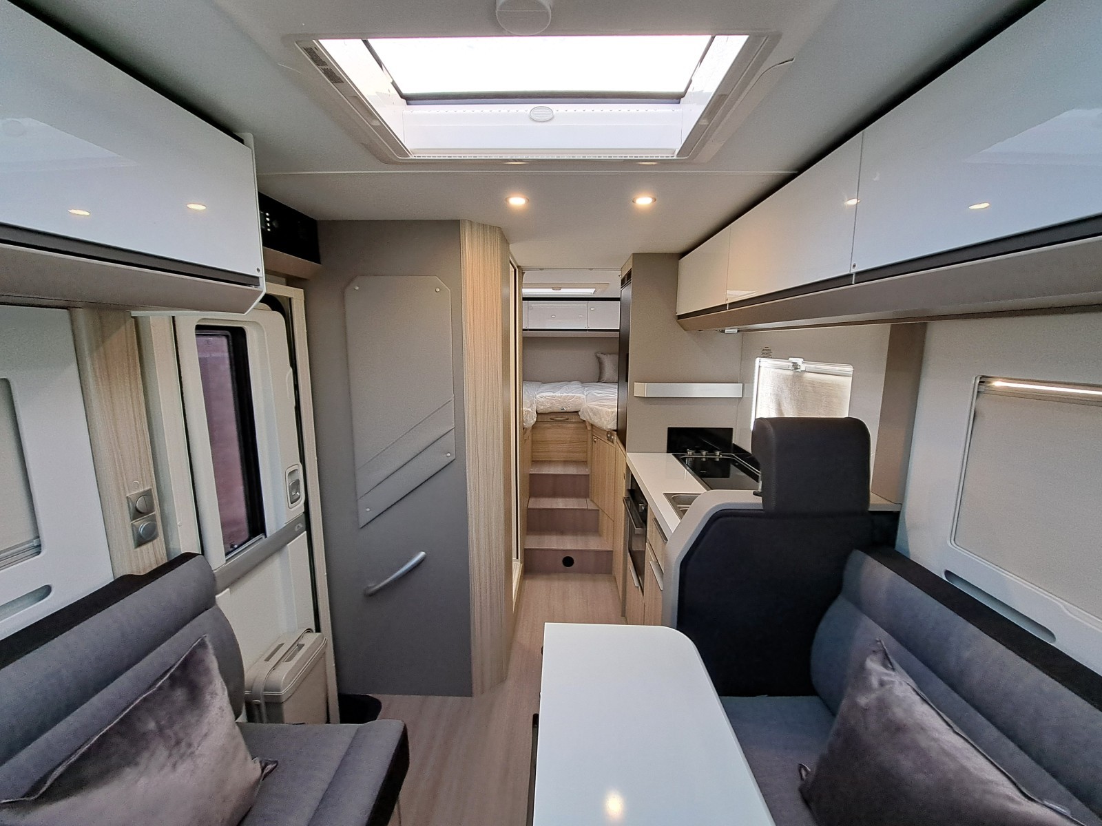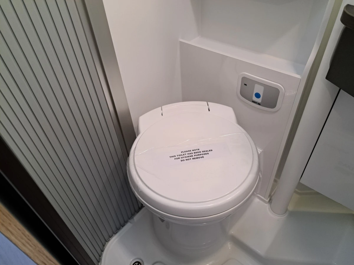 Choose between fixed twin single beds or a large rear double. The bright lounge area benefits from Adria’s panoramic sunroof, while the fully equipped kitchen includes a 3-burner hob, combi oven, and fridge-freezer. The smart bathroom layout offers shower, toilet, and storage all in a compact space.